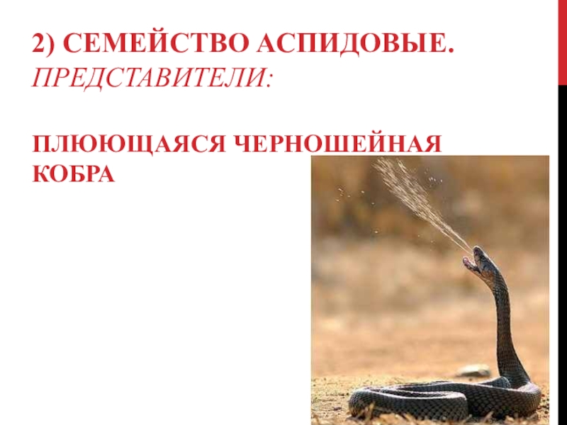 2) СЕМЕЙСТВО АСПИДОВЫЕ.  ПРЕДСТАВИТЕЛИ: ПЛЮЮЩАЯСЯ ЧЕРНОШЕЙНАЯ