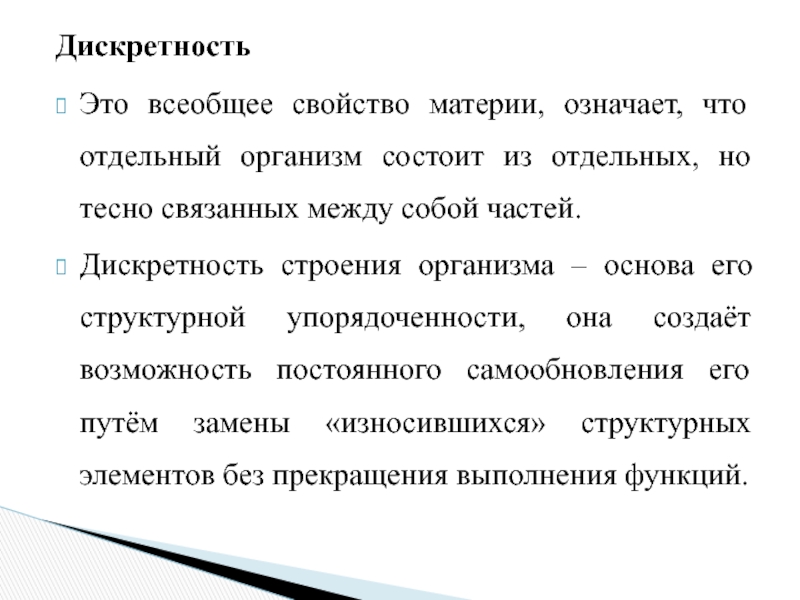Дискретность строения организма – основа его структурной упорядоченности, она создаёт возможность постоянного самообновления его путём замены «износившихся» структурных элементов без прекращения выполнения функций.