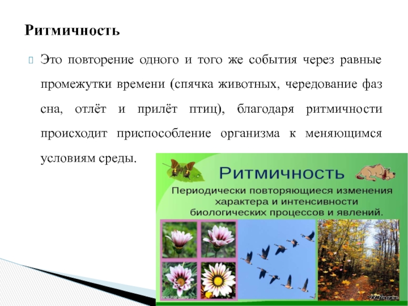 (спячка животных, чередование фаз сна, отлёт и прилёт птиц), благодаря ритмичности происходит приспособление организма к меняющимся условиям среды.