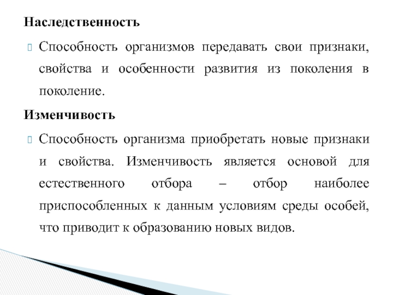 Способность организма приобретать новые признаки и свойства. Изменчивость является основой для естественного отбора – отбор наиболее приспособленных к данным условиям среды особей, что приводит к образованию новых видов.