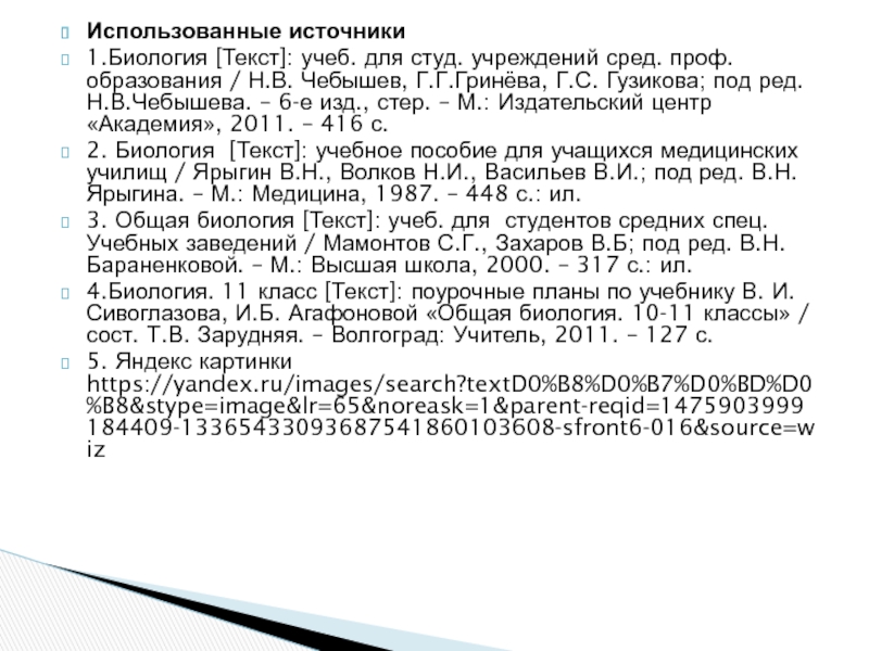3. Общая биология [Текст]: учеб. для студентов средних спец. Учебных заведений / Мамонтов С.Г., Захаров В.Б; под ред. В.Н. Бараненковой. – М.: Высшая школа, 2000. – 317 с.: ил.