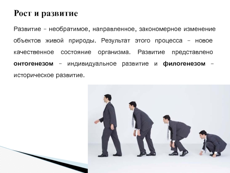 Результат этого процесса – новое качественное состояние организма. Развитие представлено онтогенезом – индивидуальное развитие и филогенезом – историческое развитие.