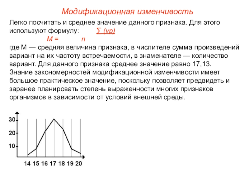 где М — средняя величина признака, в числителе сумма произведений вариант на их частоту встречаемости, в знаменателе — количество вариант. Для данного признака среднее значение равно 17,13.