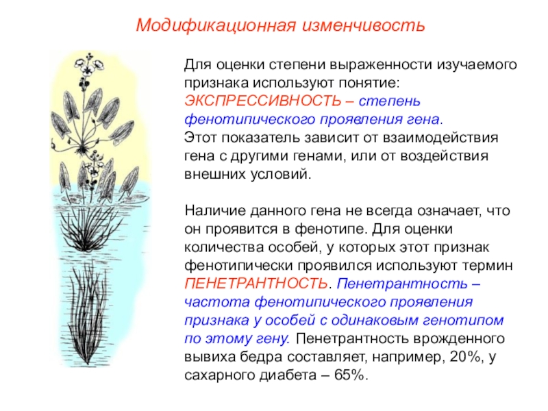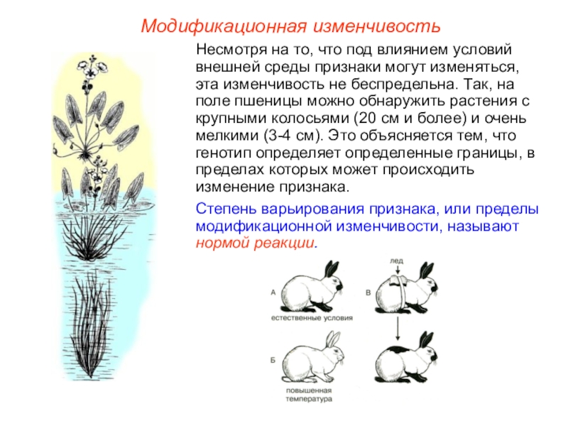 Классическим примером изменчивости признаков под действием факторов внешней среды является разнолистность у стрелолиста: погруженные в воду листья имеют лентовидную форму, листья, плавающие на поверхности воды, — округлую, а находящиеся в воздушной среде, — стреловидные. Если же все растение оказывается полностью погруженным в воду, его листья только лентовидные.