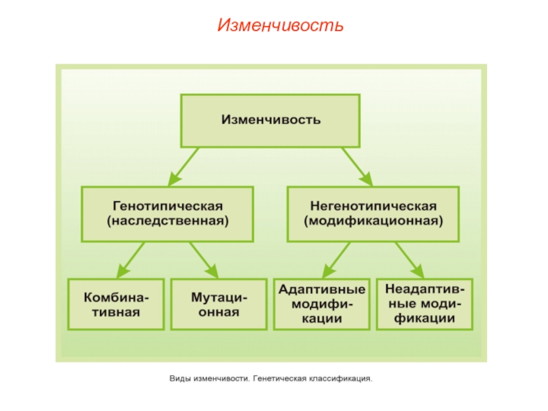 Наследственная, или генотипическая, индивидуальная, неопределенная — изменения признаков организма, обусловленные изменением генотипа;