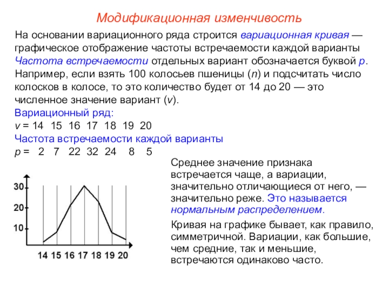Например, если взять 100 колосьев пшеницы (n) и подсчитать число колосков в колосе, то это количество будет от 14 до 20 — это численное значение вариант (v).