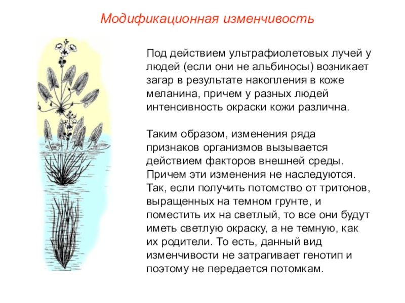 Таким образом, изменения ряда признаков организмов вызывается действием факторов внешней среды. Причем эти изменения не наследуются. Так, если получить потомство от тритонов, выращенных на темном грунте, и поместить их на светлый, то все они будут иметь светлую окраску, а не темную, как их родители. То есть, данный вид изменчивости не затрагивает генотип и поэтому не передается потомкам.