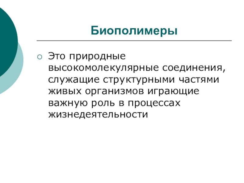 БиополимерыЭто природные высокомолекулярные соединения, служащие структурными частями живых организмов играющие важную роль в процессах жизнедеятельности