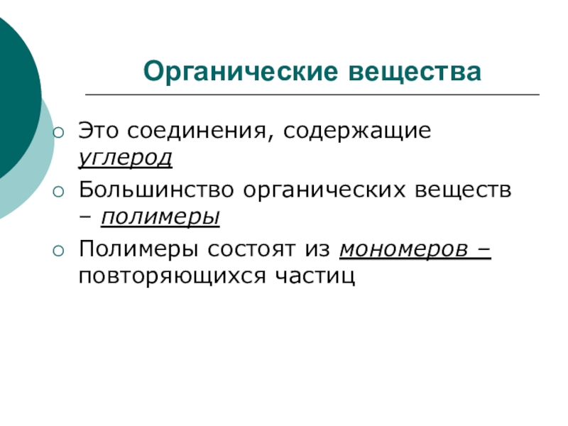 Органические веществаЭто соединения, содержащие углеродБольшинство органических веществ – полимерыПолимеры состоят из мономеров – повторяющихся частиц