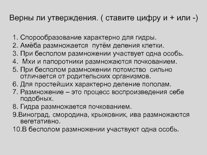 Верны ли утверждения. ( ставите цифру и + или -)