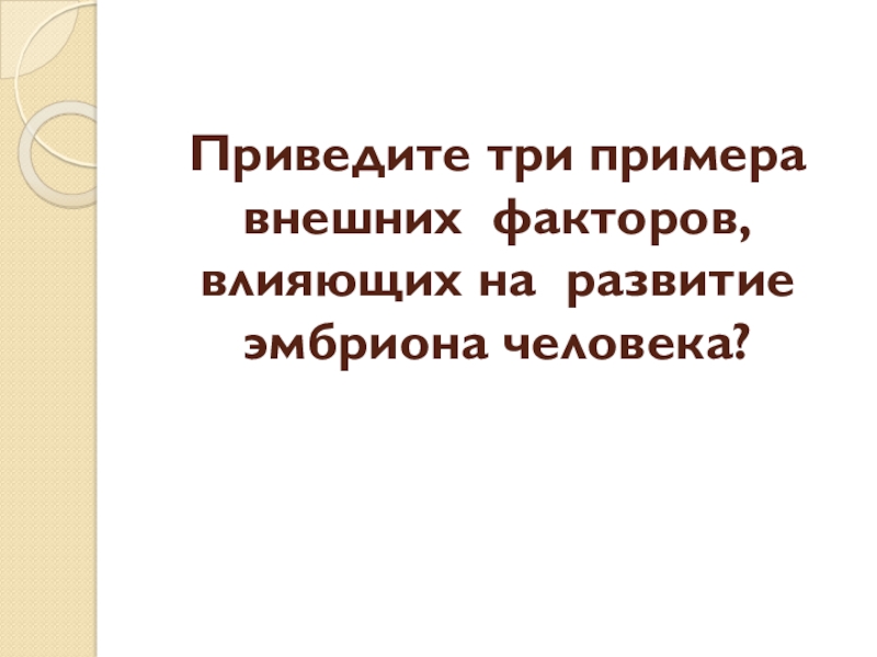 Слайд 5Приведите три примера внешних факторов, влияющих на развитие эмбриона человека?