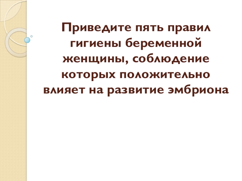 Слайд 9Приведите пять правил гигиены беременной женщины, соблюдение которых положительно влияет на