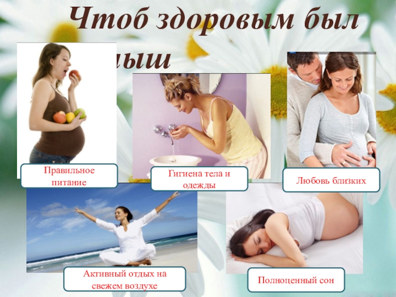 Чтоб здоровым был малышПравильное питаниеГигиена тела и одеждыЛюбовь близкихПолноценный сонАктивный отдых на свежем воздухе