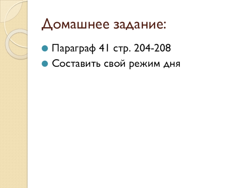 Домашнее задание:Параграф 41 стр. 204-208Составить свой режим дня