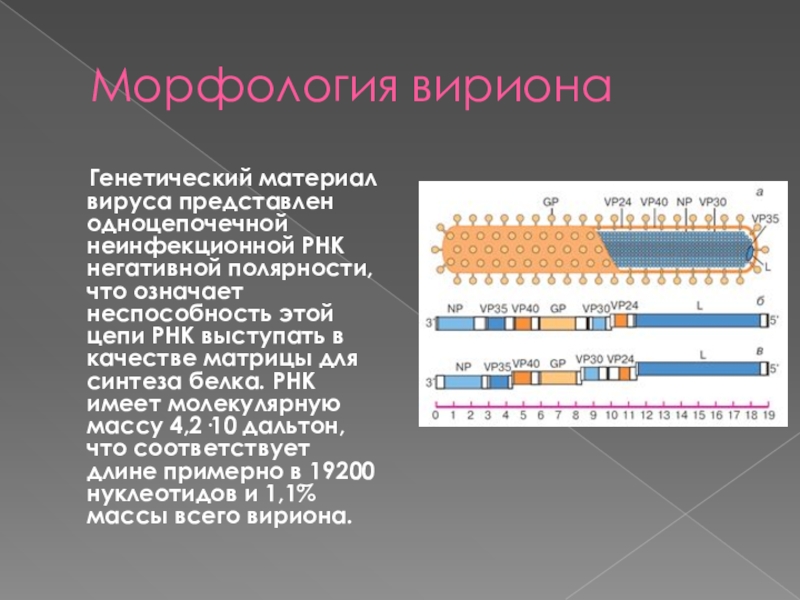 РНК негативной полярности, что означает неспособность этой цепи РНК выступать в качестве матрицы для синтеза белка. РНК имеет молекулярную массу 4,2·10 дальтон, что соответствует длине примерно в 19200 нуклеотидов и 1,1% массы всего вириона.