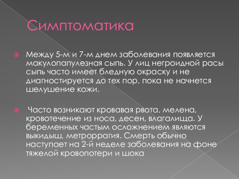 Часто возникают кровавая рвота, мелена, кровотечение из носа, десен, влагалища. У беременных частым осложнением являются выкидыш, метроррагия. Смерть обычно наступает на 2-й неделе заболевания на фоне тяжелой кровопотери и шока