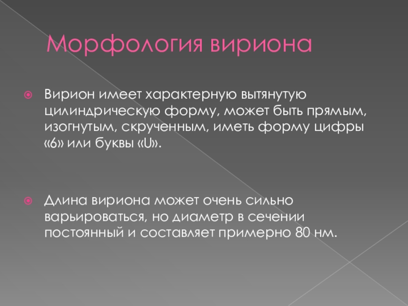 Длина вириона может очень сильно варьироваться, но диаметр в сечении постоянный и составляет примерно 80 нм.
