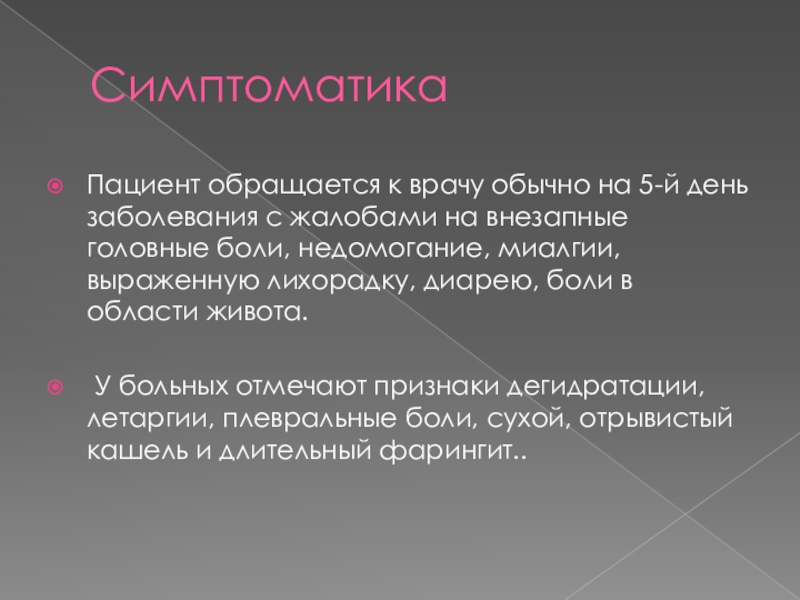 У больных отмечают признаки дегидратации, летаргии, плевральные боли, сухой, отрывистый кашель и длительный фарингит..