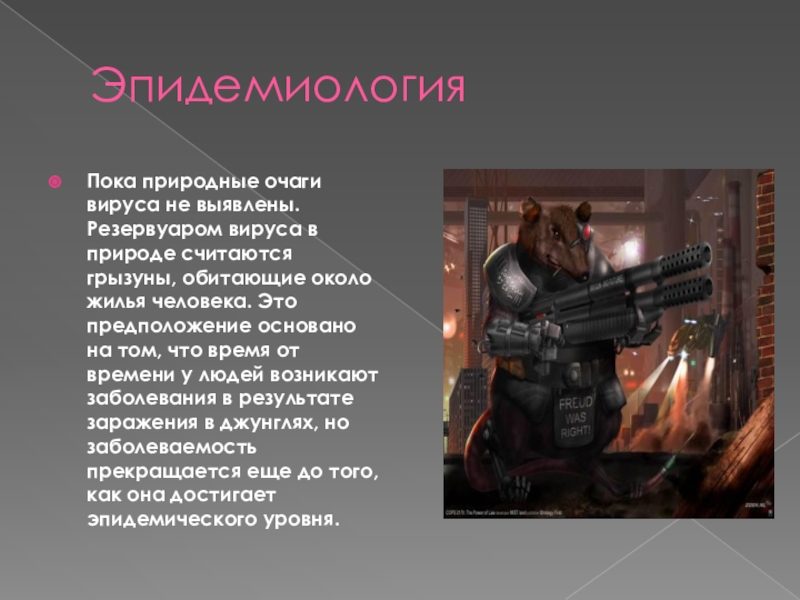 грызуны, обитающие около жилья человека. Это предположение основано на том, что время от времени у людей возникают заболевания в результате заражения в джунглях, но заболеваемость прекращается еще до того, как она достигает эпидемического уровня.