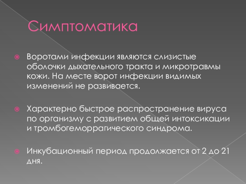 Характерно быстрое распространение вируса по организму с развитием общей интоксикации и тромбогеморрагического синдрома.
