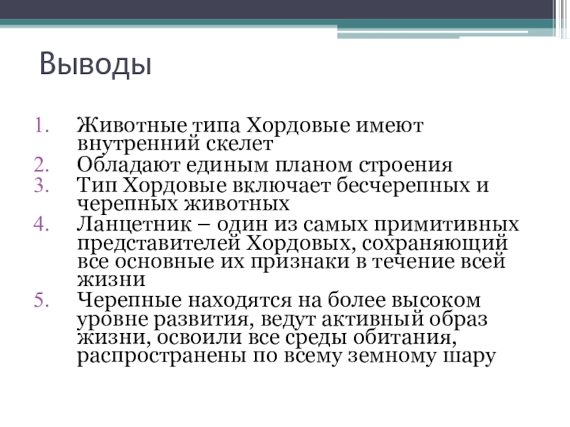 ВыводыЖивотные типа Хордовые имеют внутренний скелет Обладают единым планом строенияТип Хордовые включает бесчерепных и черепных животныхЛанцетник –