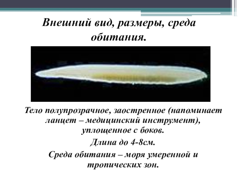 Внешний вид, размеры, среда обитания.Тело полупрозрачное, заостренное (напоминает ланцет – медицинский инструмент), уплощенное с боков.Длина до