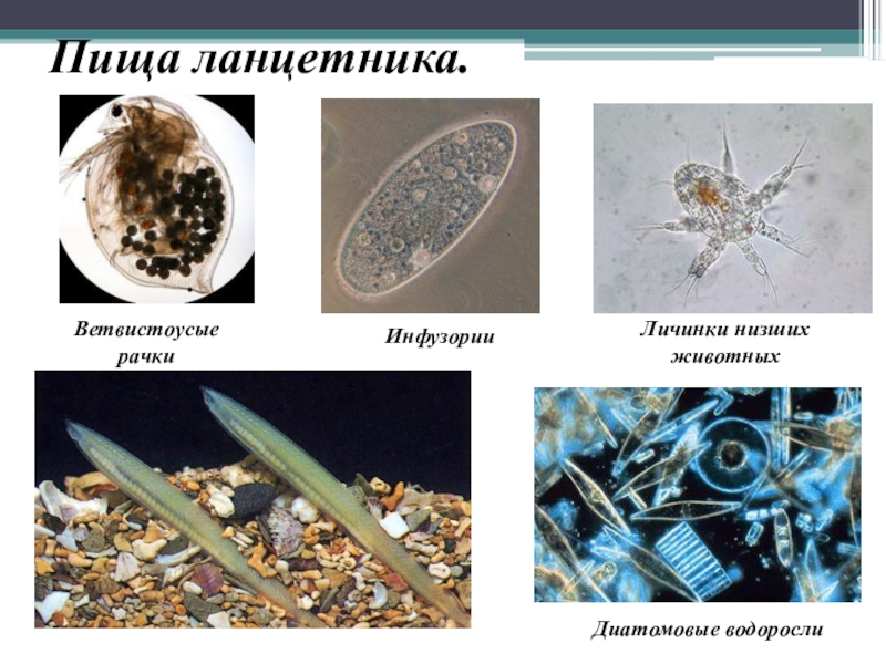 Пища ланцетника.Ветвистоусые рачкиИнфузории Личинки низших животныхДиатомовые водоросли