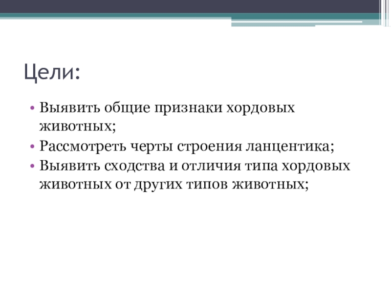 Цели:Выявить общие признаки хордовых животных;Рассмотреть черты строения ланцентика;Выявить сходства и отличия типа хордовых животных от других типов