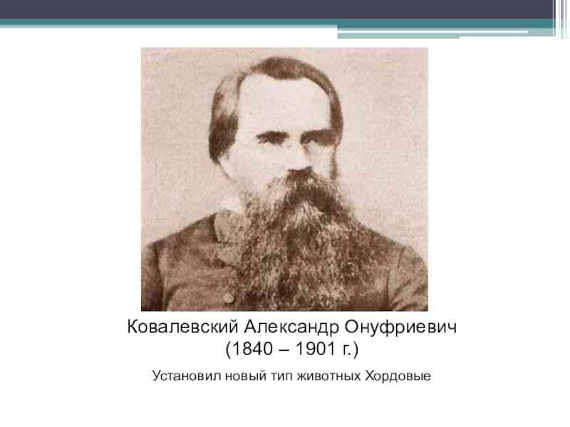 Ковалевский Александр Онуфриевич      (1840 – 1901 г.)Установил новый тип животных Хордовые