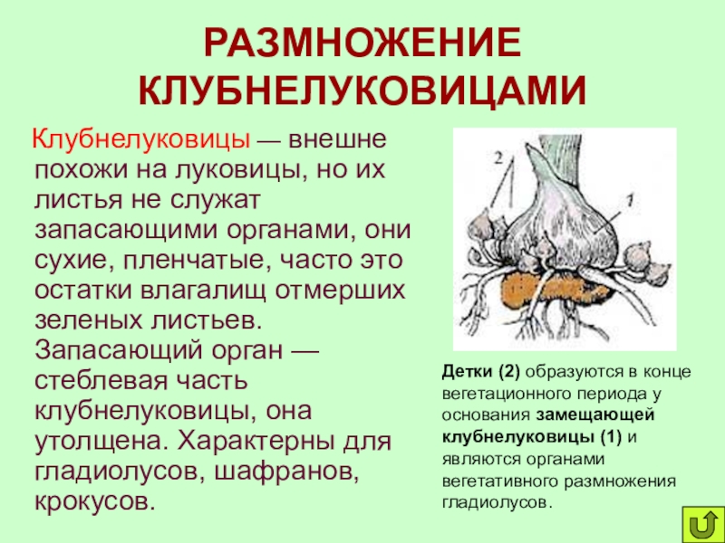 Детки (2) образуются в конце вегетационного периода у основания замещающей клубнелуковицы (1) и являются органами вегетативного размножения гладиолусов.