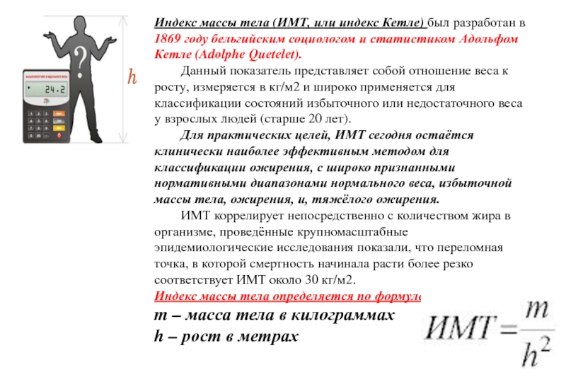Слайд 7Индекс массы тела (ИМТ, или индекс Кетле) был разработан в 1869