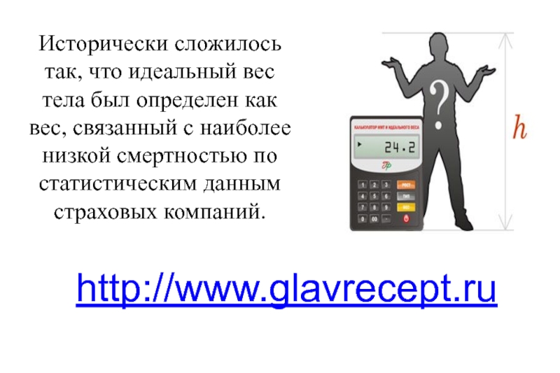 http://www.glavrecept.ruИсторически сложилось так, что идеальный вес тела был определен как вес, связанный с наиболее низкой смертностью по