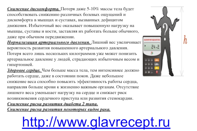 http://www.glavrecept.ruСнижение дискомфорта. Потеря даже 5-10% массы тела будет способствовать снижению различных болевых ощущений и дискомфорта в мышцах