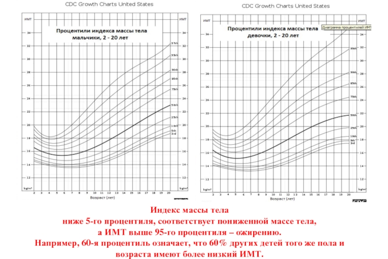 Индекс массы тела ниже 5-го процентиля, соответствует пониженной массе тела, а ИМТ выше 95-го процентиля – ожирению.