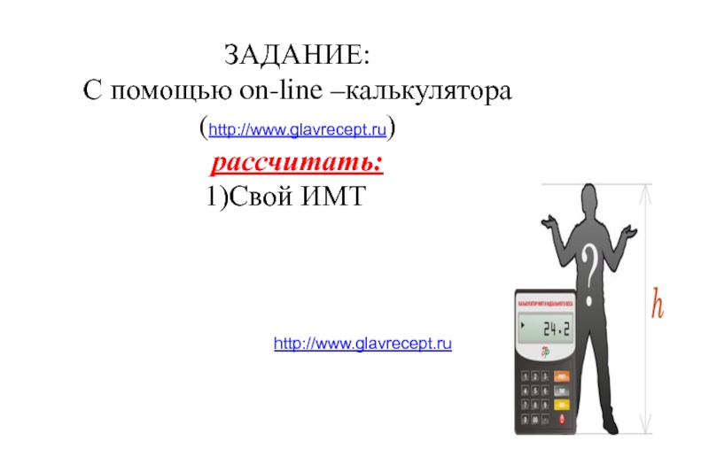 http://www.glavrecept.ruЗАДАНИЕ:С помощью on-line –калькулятора (http://www.glavrecept.ru)рассчитать:Свой ИМТ