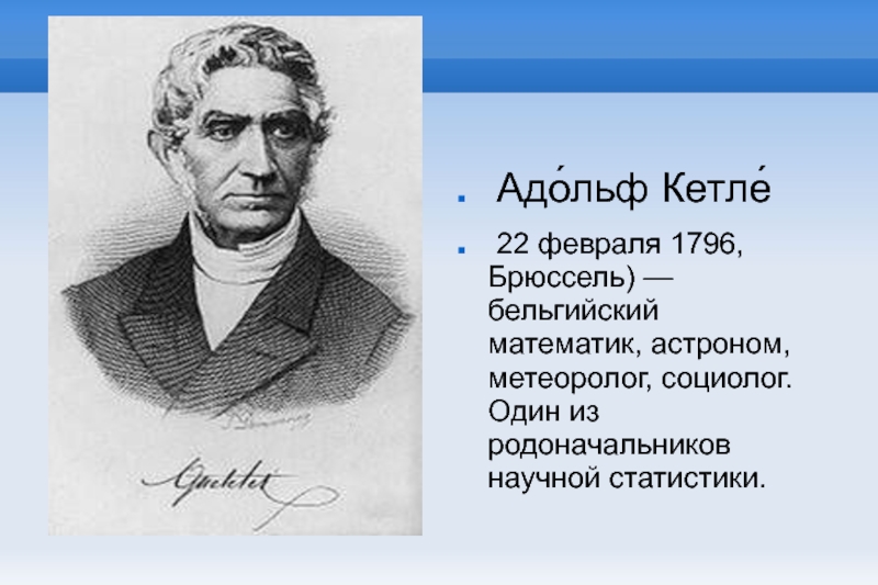 Адо́льф Кетле́ 22 февраля 1796, Брюссель) — бельгийский математик, астроном, метеоролог, социолог. Один из родоначальников научной