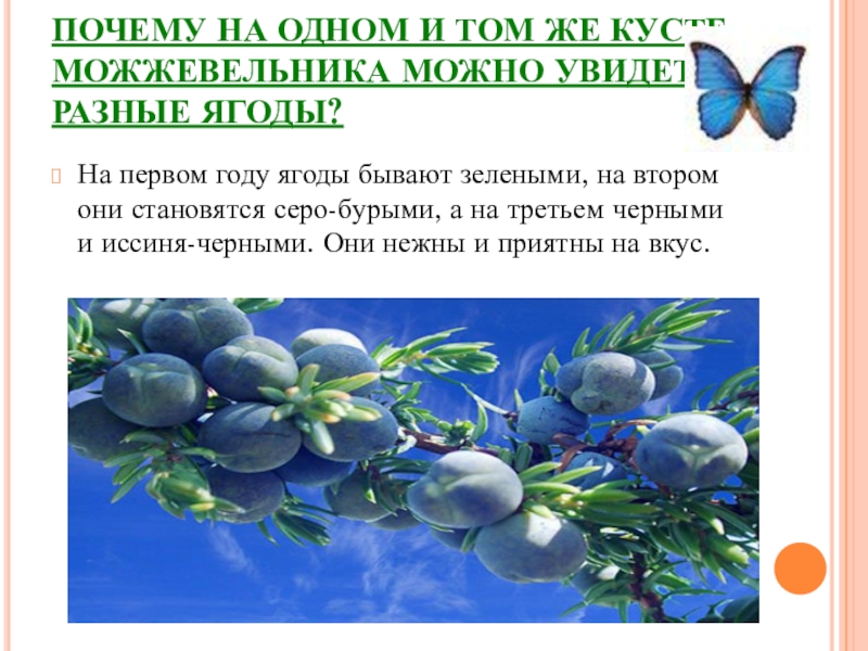 Слайд 14ПОЧЕМУ НА ОДНОМ И ТОМ ЖЕ КУСТЕ МОЖЖЕВЕЛЬНИКА МОЖНО УВИДЕТЬ РАЗНЫЕ