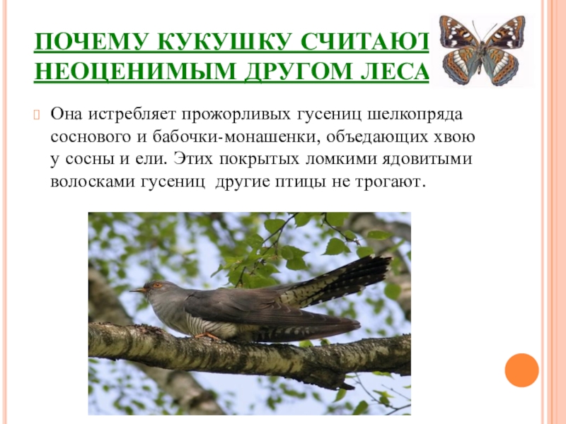 Слайд 5ПОЧЕМУ КУКУШКУ СЧИТАЮТ НЕОЦЕНИМЫМ ДРУГОМ ЛЕСА?