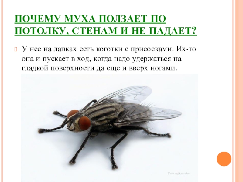Слайд 13ПОЧЕМУ МУХА ПОЛЗАЕТ ПО ПОТОЛКУ, СТЕНАМ И НЕ ПАДАЕТ?