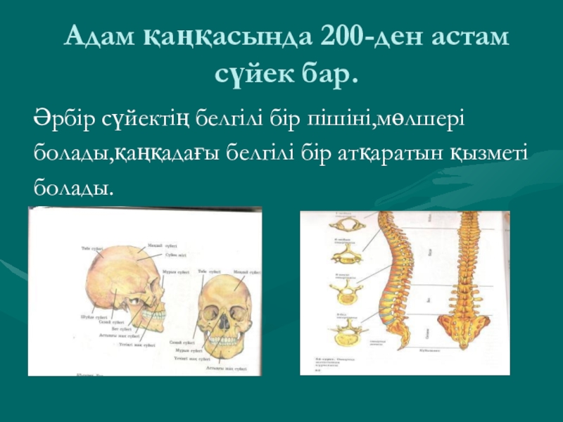 Адам қаңқасында 200-ден астам сүйек бар.Әрбір сүйектің белгілі бір пішіні,мөлшеріболады,қаңқадағы белгілі бір атқаратын қызметіболады.