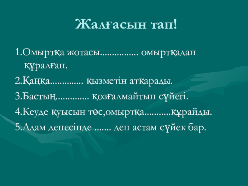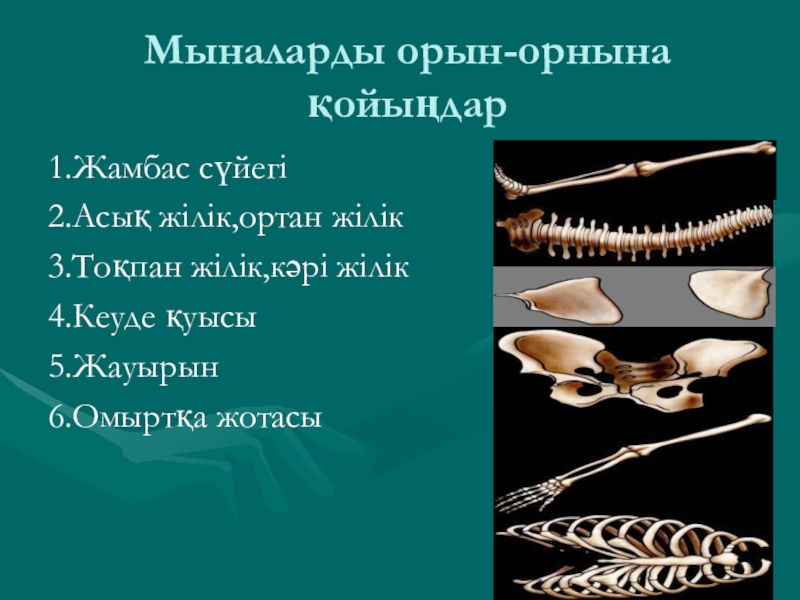 Мыналарды орын-орнына қойыңдар1.Жамбас сүйегі2.Асық жілік,ортан жілік3.Тоқпан жілік,кәрі жілік4.Кеуде қуысы5.Жауырын6.Омыртқа жотасы