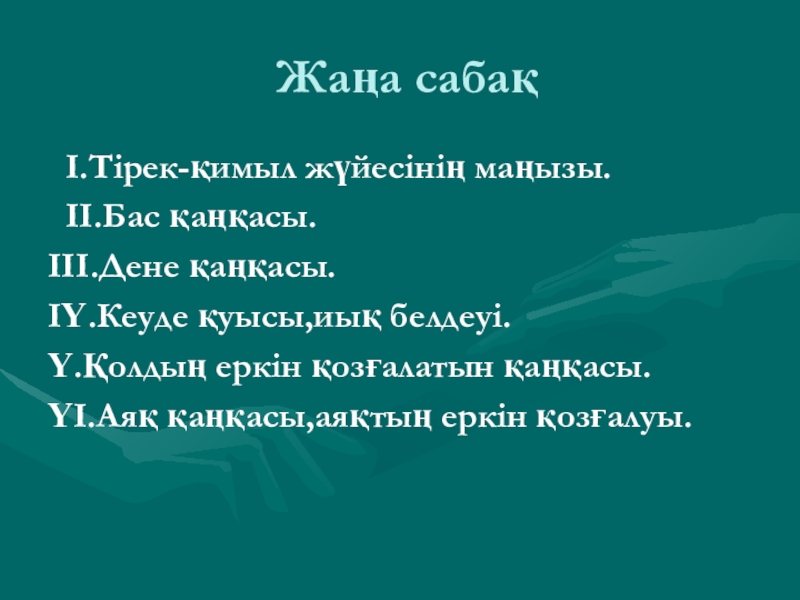 Жаңа сабақ І.Тірек-қимыл жүйесінің маңызы. ІІ.Бас қаңқасы.ІІІ.Дене қаңқасы.ІҮ.Кеуде қуысы,иық белдеуі.Ү.Қолдың еркін қозғалатын қаңқасы.ҮІ.Аяқ қаңқасы,аяқтың еркін қозғалуы.