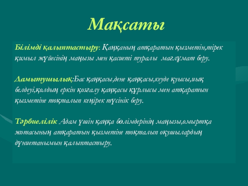 МақсатыБілімді қалыптастыру: Қаңқаның атқаратын қызметін,тірекқимыл жүйесінің маңызы мен қасиеті туралы мағлұмат беру.Дамытушылық:Бас қаңқасы,дене қаңқасы,кеуде қуысы,иықбелдеуі,қолдың еркін қозғалу