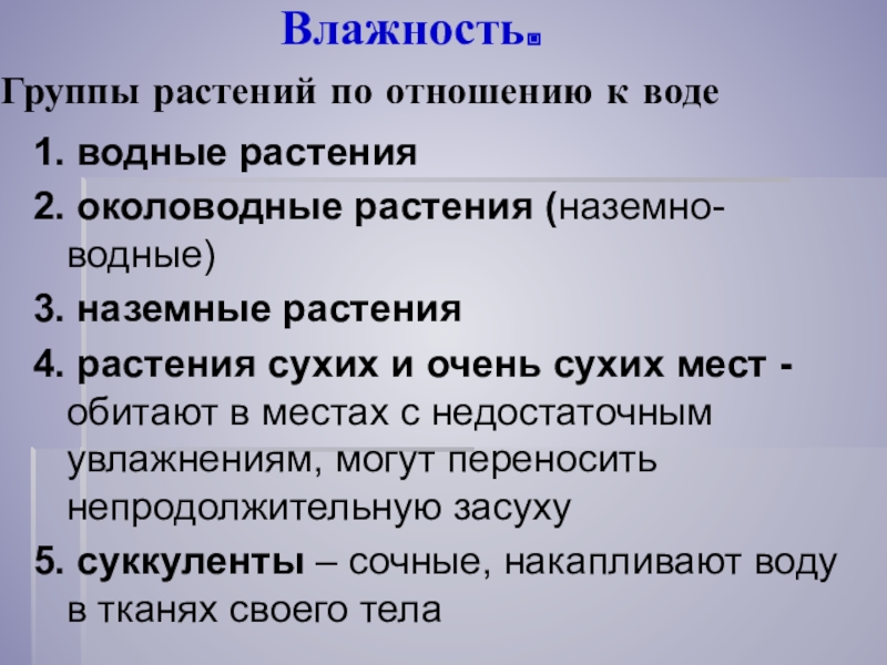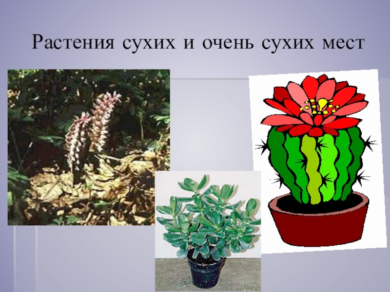 4. растения сухих и очень сухих мест - обитают в местах с недостаточным увлажнениям, могут переносить непродолжительную засуху
