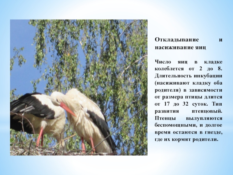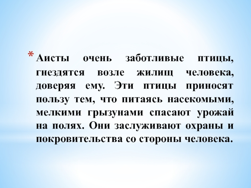 Слайд 20Аисты очень заботливые птицы, гнездятся возле жилищ человека, доверяя ему. Эти