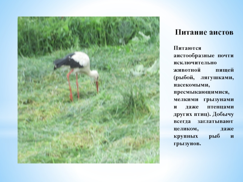 Питаются аистообразные почти исключительно животной пищей (рыбой, лягушками, насекомыми,