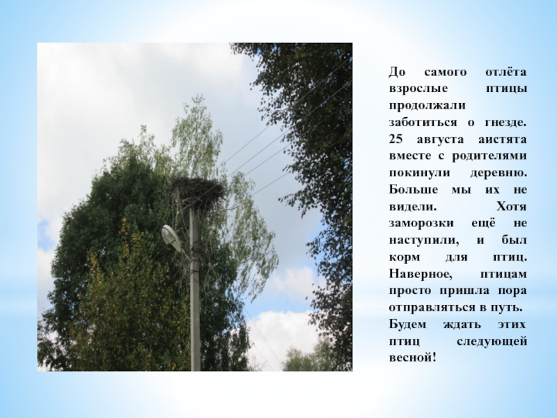 Слайд 19До самого отлёта взрослые птицы продолжали заботиться о гнезде. 25 августа