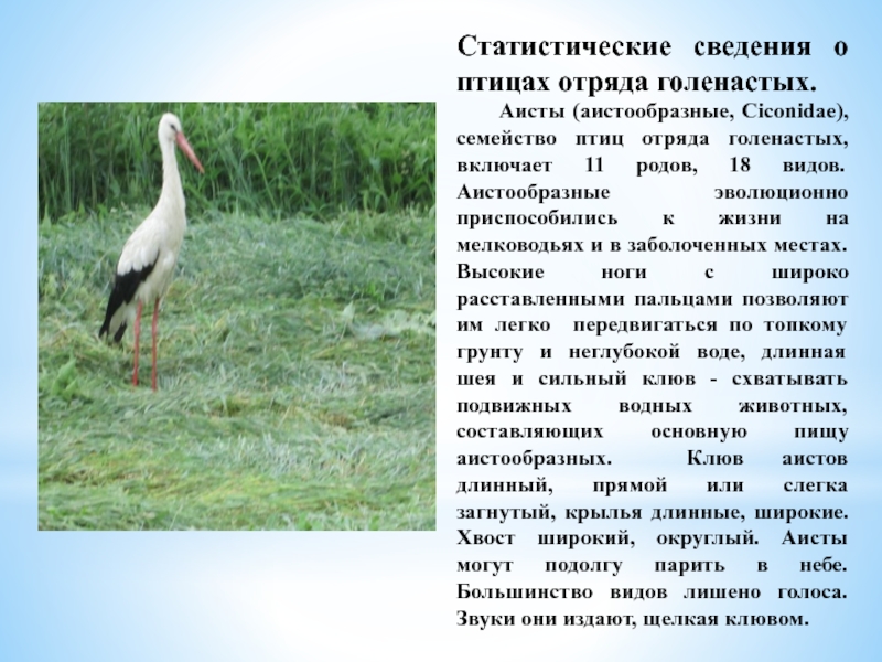 семейство птиц отряда голенастых, включает 11 родов, 18 видов. Аистообразные эволюционно приспособились к жизни на мелководьях и в заболоченных местах. Высокие ноги с широко расставленными пальцами позволяют им легко передвигаться по топкому грунту и неглубокой воде, длинная шея и сильный клюв - схватывать подвижных водных животных, составляющих основную пищу аистообразных. Клюв аистов длинный, прямой или слегка загнутый, крылья длинные, широкие. Хвост широкий, округлый. Аисты могут подолгу парить в небе. Большинство видов лишено голоса. Звуки они издают, щелкая клювом.