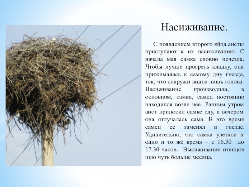 яйца аисты приступают к их насиживанию. С начала мая самка словно исчезла. Чтобы лучше прогреть кладку, она прижималась к самому дну гнезда, так, что снаружи видна лишь голова. Насиживание производила, в основном, самка, самец постоянно находился возле нее. Ранним утром аист приносил самке еду, а вечером она отлучалась сама. В это время самец ее заменял в гнезде. Удивительно, что самка улетала в одно и то же время – с 16.30 до 17.30 часов. Высиживание птенцов шло чуть больше месяца.