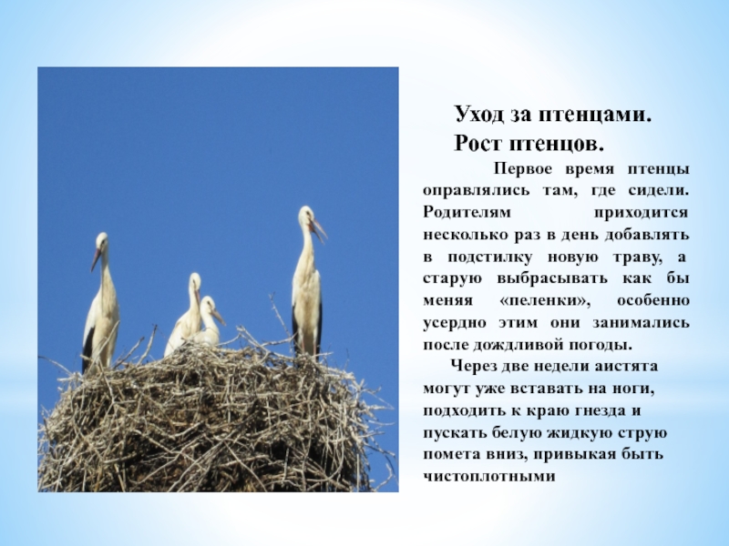 Через две недели аистята могут уже вставать на ноги, подходить к краю гнезда и пускать белую жидкую струю помета вниз, привыкая быть чистоплотными